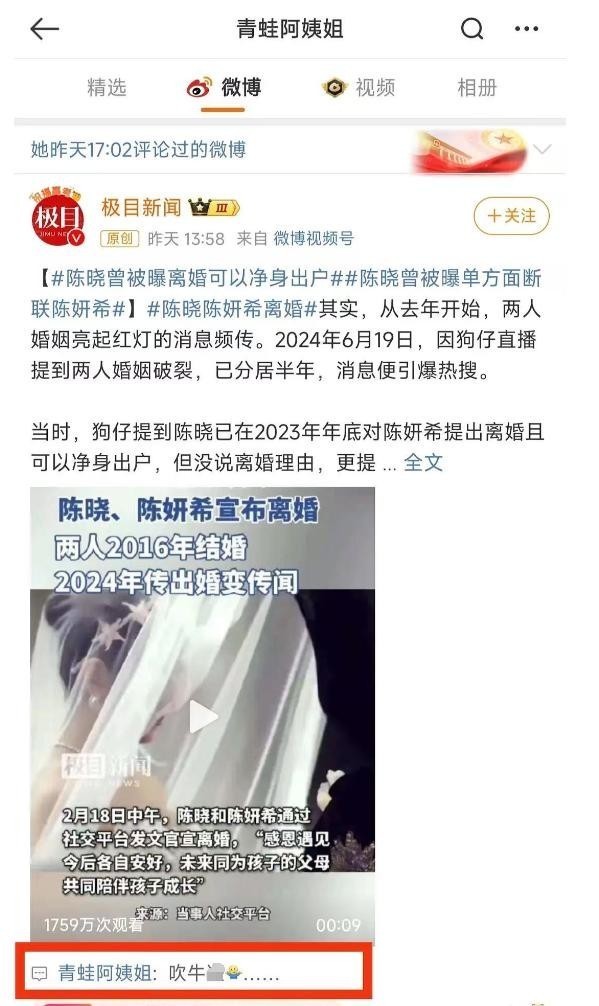 这位名叫“青蛙阿姨姐”的网友,是导演滕华涛的妻子,多年前他与陈妍希因携手拍摄《奔爱》而相识,或许正是因为这一次的合作,使她与其妻子周圆圆交好。